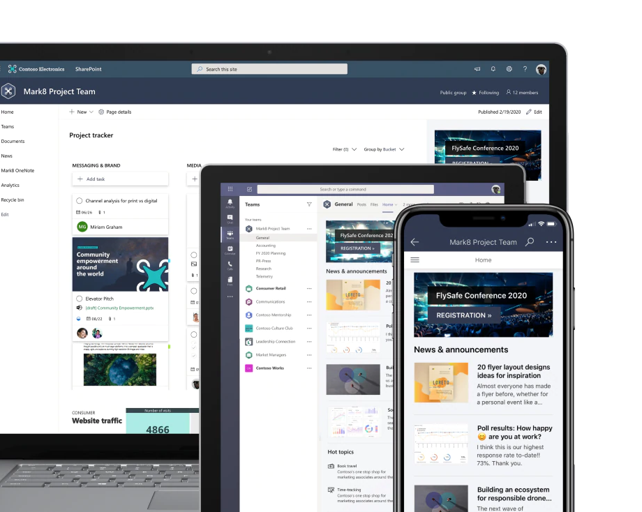 SharePoint styrker gruppearbeid med dynamiske og produktive gruppeområder for hver prosjektgruppe og hver avdeling. Del filer, data, nyheter og ressurser. Tilpass området for å effektivisere gruppearbeidet. Samarbeid uanstrengt og sikkert med gruppemedlemmer innenfor og utenfor organisasjonen, på tvers av PC-er, Mac-er og mobile enheter.