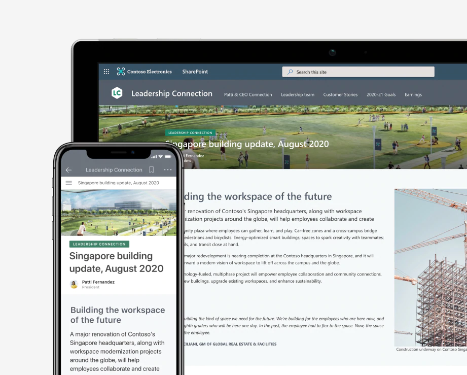 Bygg opp samhørighet og øk de ansattes engasjement med omfattende multimedia og felleskapsdialog på intranettet ditt. Styrk organisasjonens effektivitet ved å dele felles ressurser og programmer på portalene og hjemmesidene. Fortell historien din med flotte kommunikasjonsområder. Og informer med personlige, målrettede nyheter på nettet og i SharePoint-mobilappene.