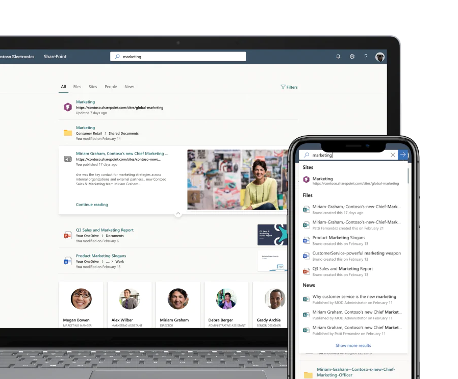 Du er bare ett klikk unna det du leter etter, med en kraftig søkefunksjon og intelligente måter å finne informasjon, ekspertise og innsikt på, noe som gjør det enklere å ta informerte beslutninger og handle rett. Den omfattende innholdsbehandlingen i SharePoint og verdifulle kontakter og samtaler i Yammer gjør at organisasjonen raskt kan dele kunnskap.